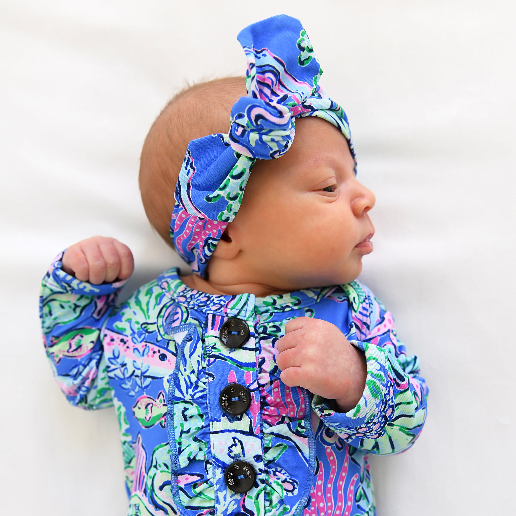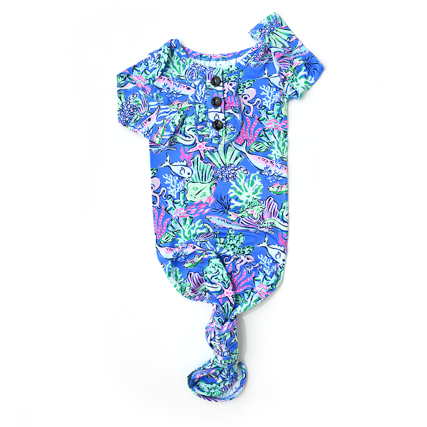 Coordinating buttons and the slits at the shoulder make taking on and off baby from the top down very easy! Knot on the gown can be tied and untied as needed for quick diaper changes!