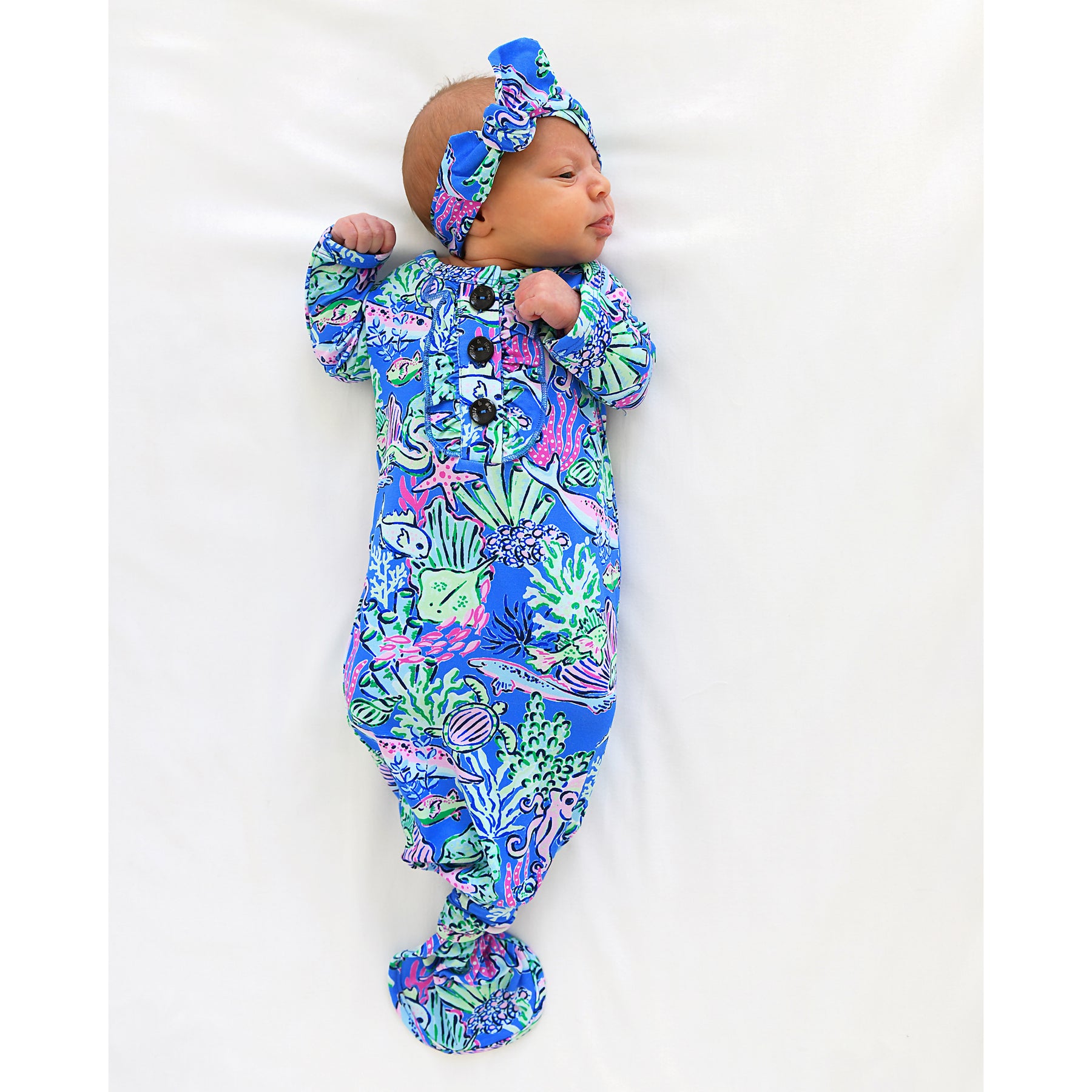 This listing is for a Newborn Sized super soft and stretchy knotted baby gown. Matching headband can be purchased along with the gown in the dropdown of this listing.