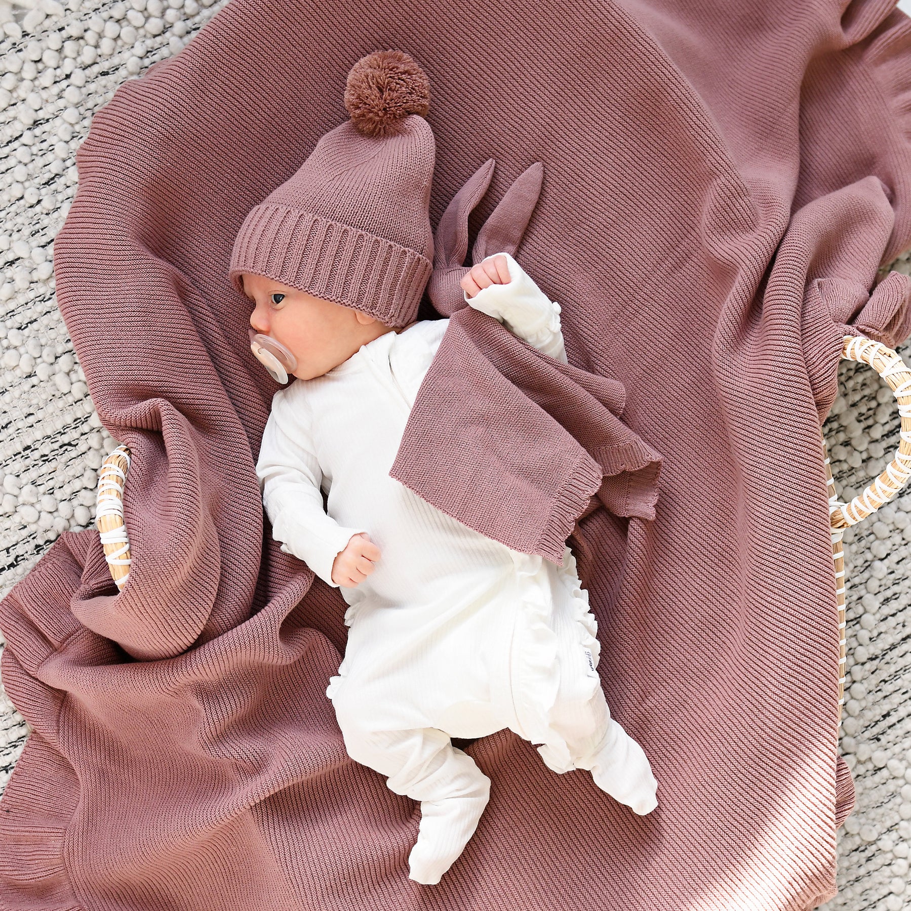 Perfect for pairing with our matching or coordinating knit bubbles, sweaters, and footed one pieces, this beanie is a timeless accessory meant to be treasured and saved as a keepsake.