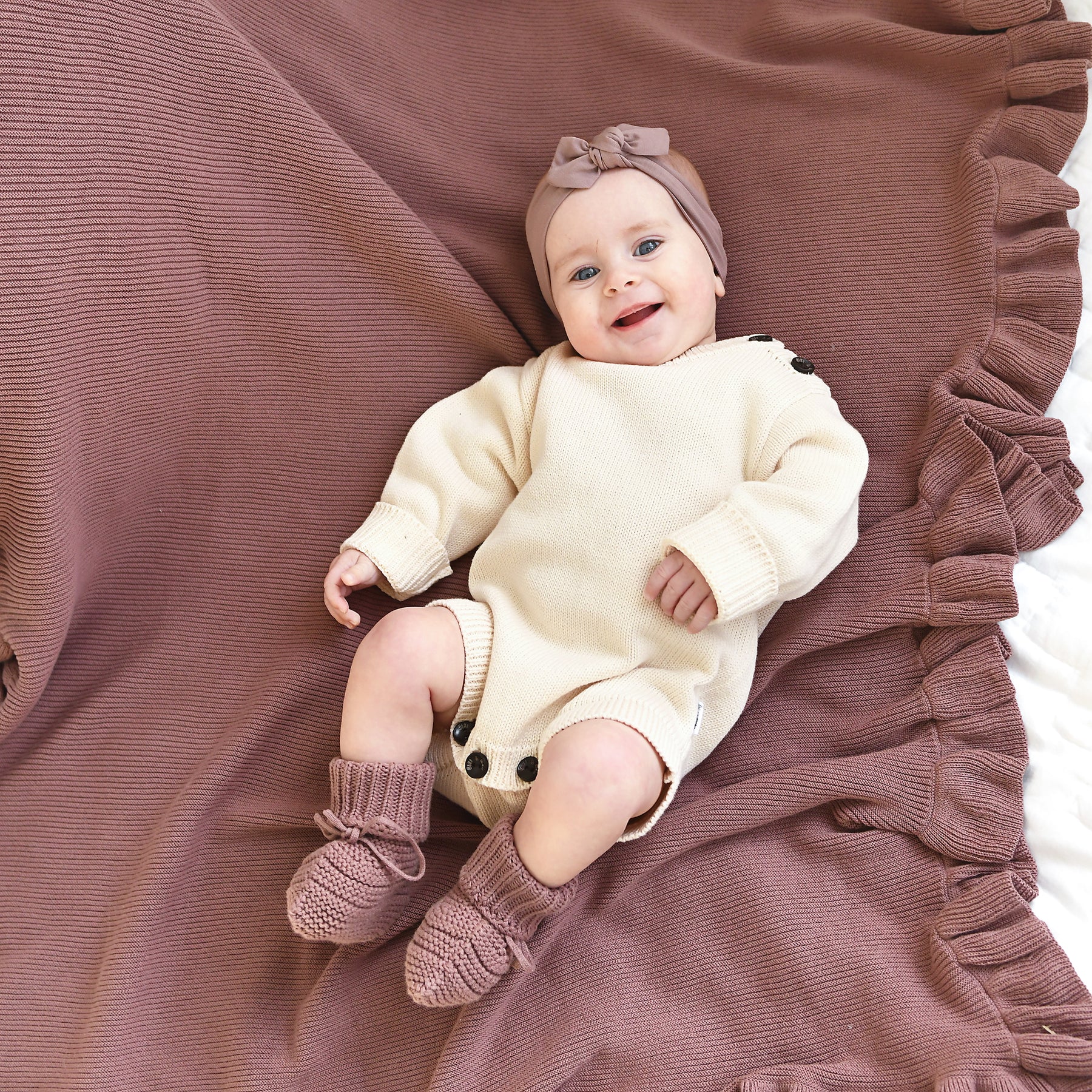 This beautifully crafted knit sweater bubble is ultra soft, cozy, and gentle on baby’s skin. Designed to feel both timeless and special, it is the kind of piece you save as a keepsake long after your little one has outgrown it.