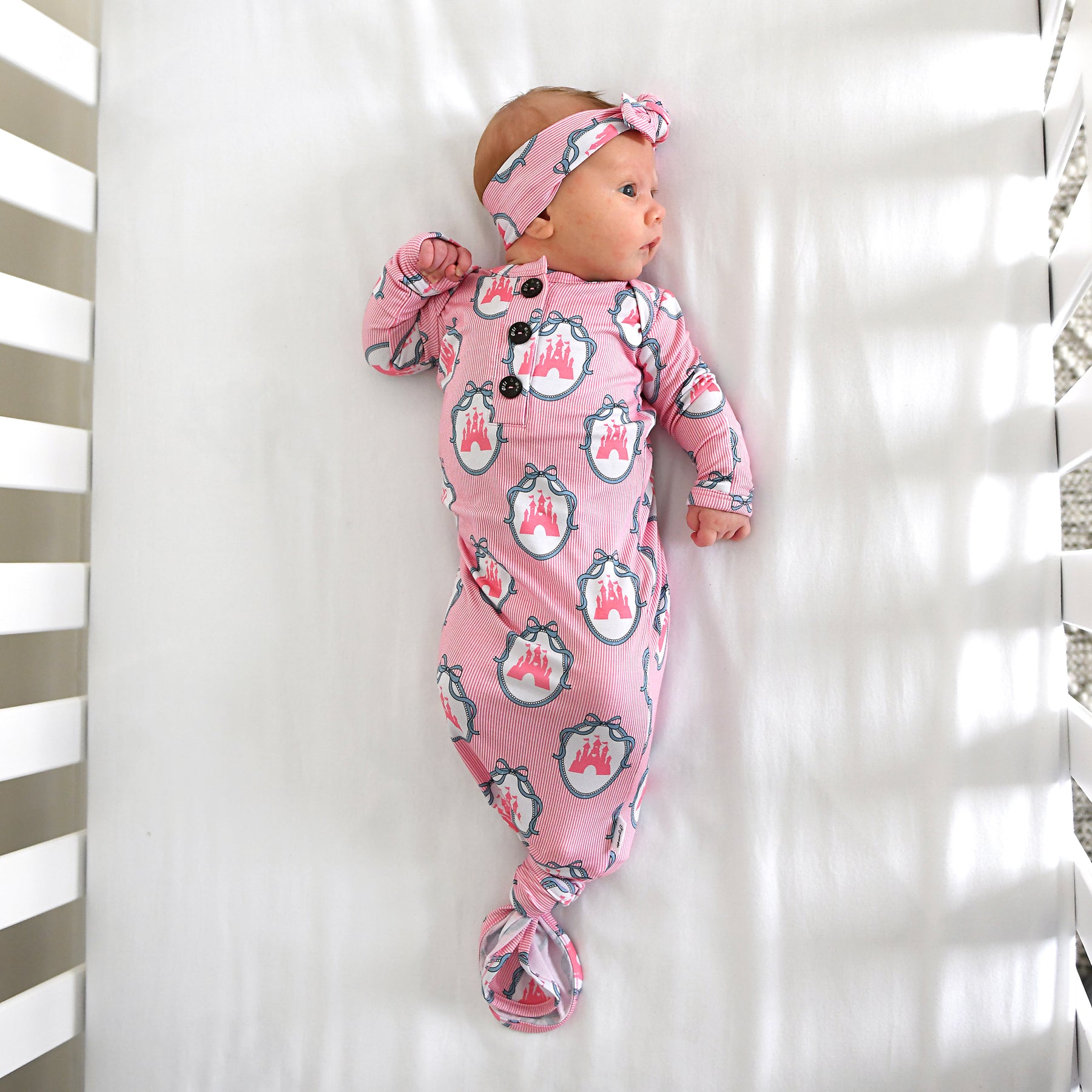 Coordinating buttons and the slits at the shoulder make taking on and off baby from the top down very easy! Knot on the gown can be tied and untied as needed for quick diaper changes!