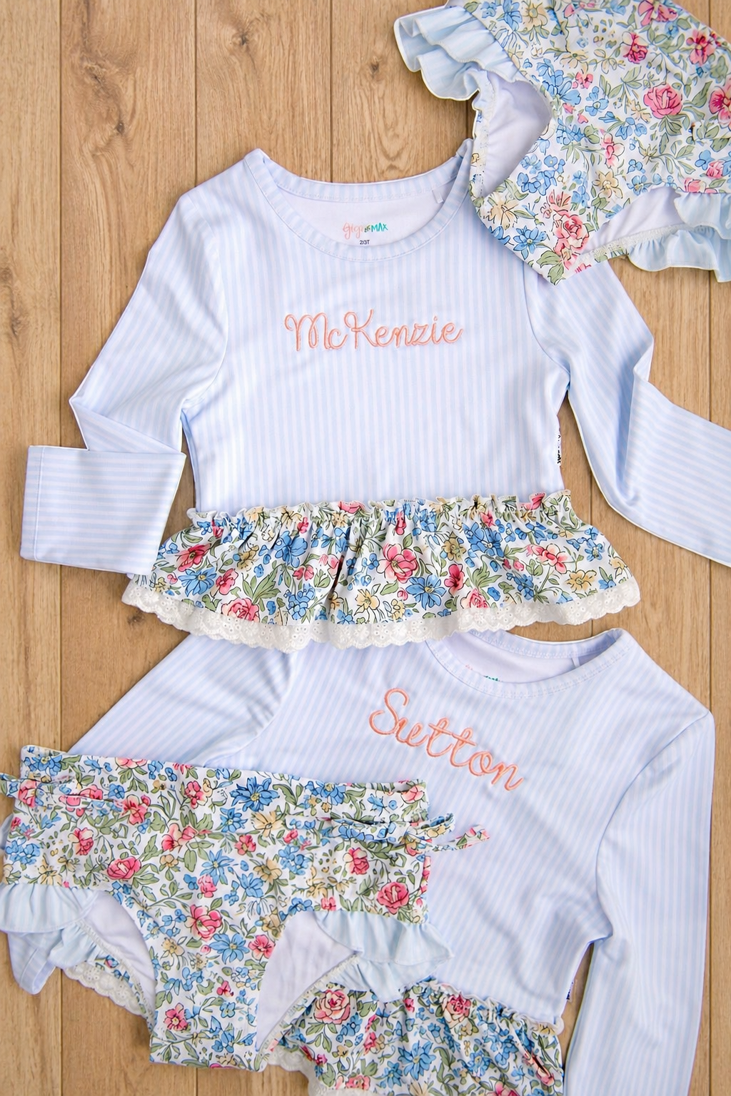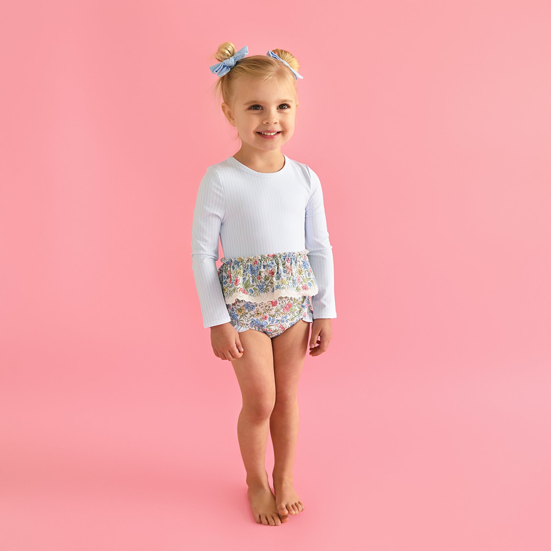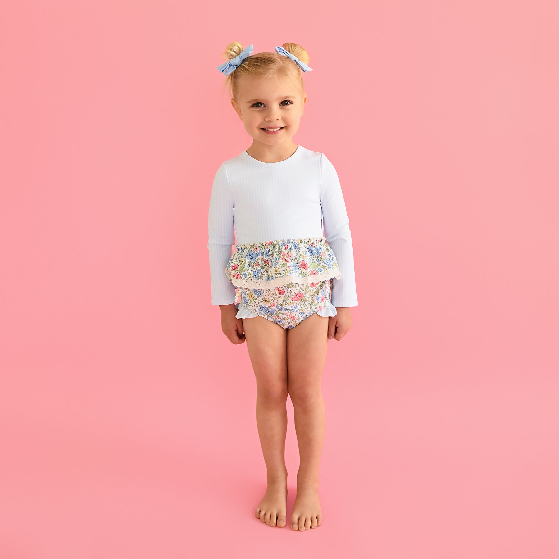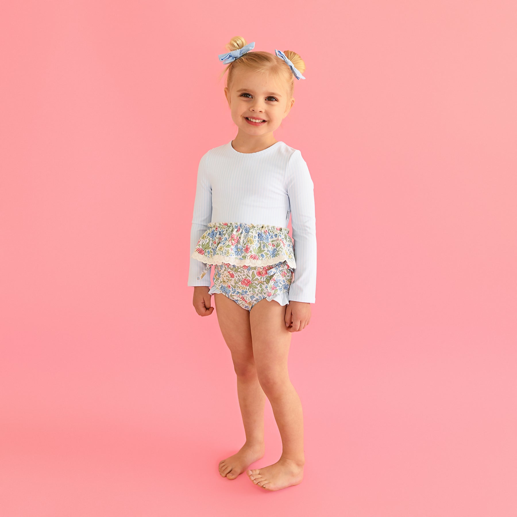 The long sleeve ruffle top features a flattering peplum fit with delicate trim, paired with coordinating full coverage bottoms that stay in place for easy movement and play.