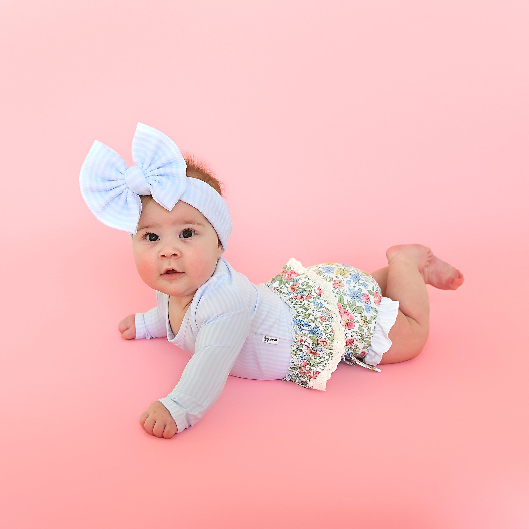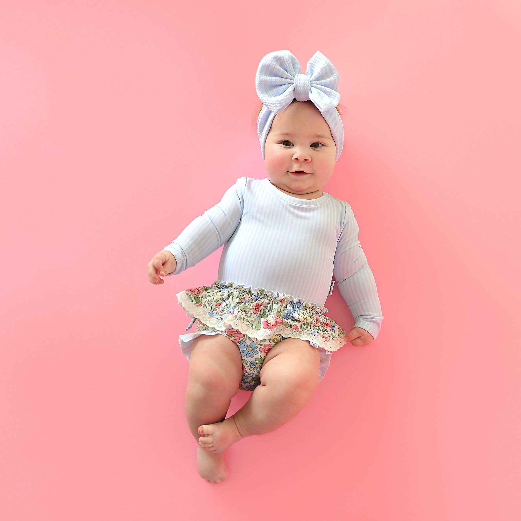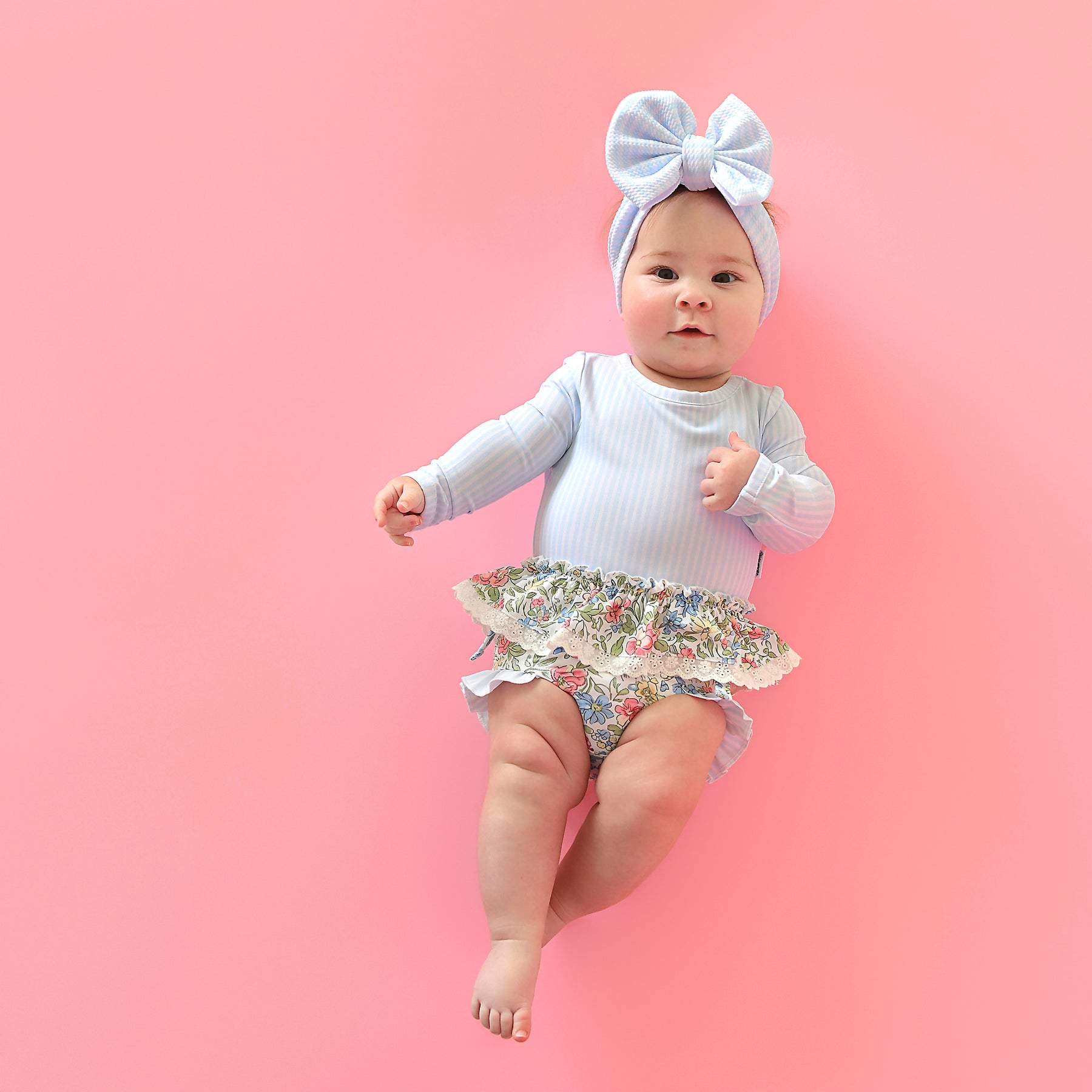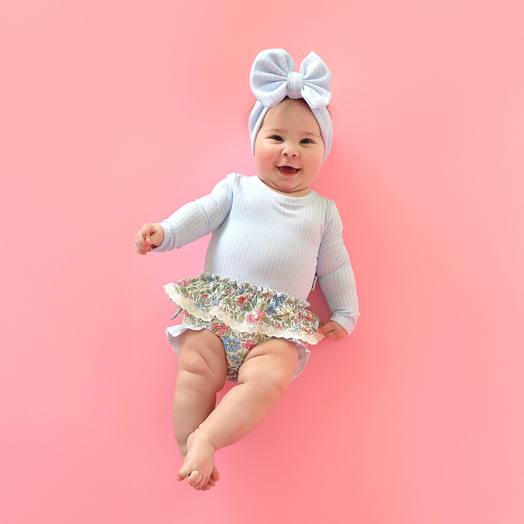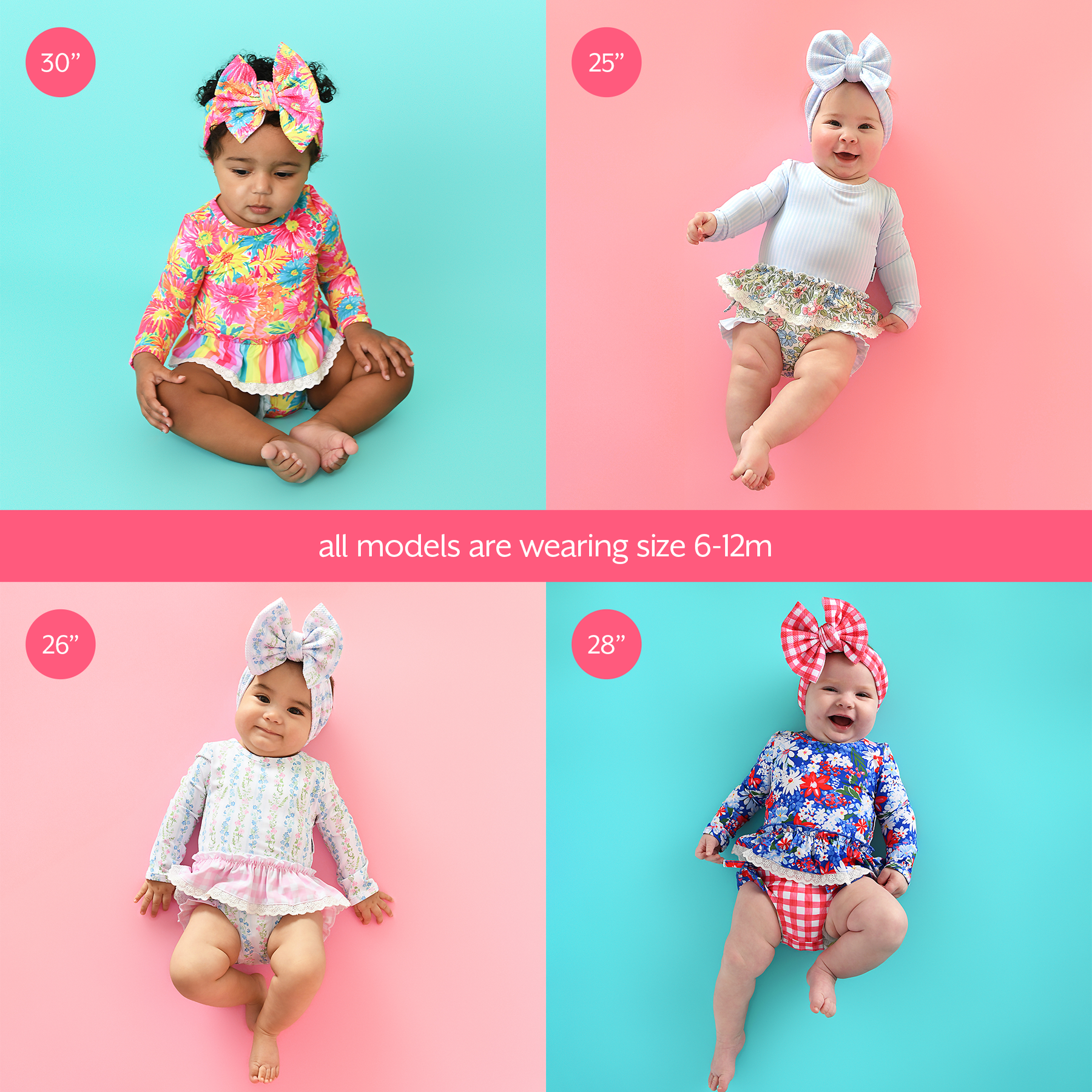 The long sleeve ruffle top features a flattering peplum fit with delicate trim, paired with coordinating full coverage bottoms that stay in place for easy movement and play.