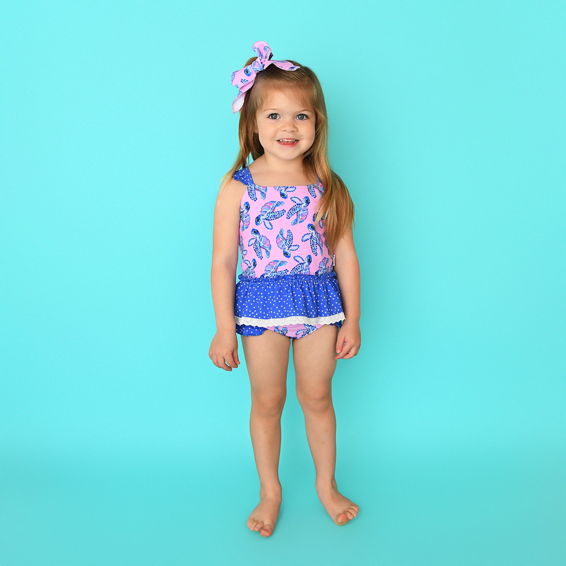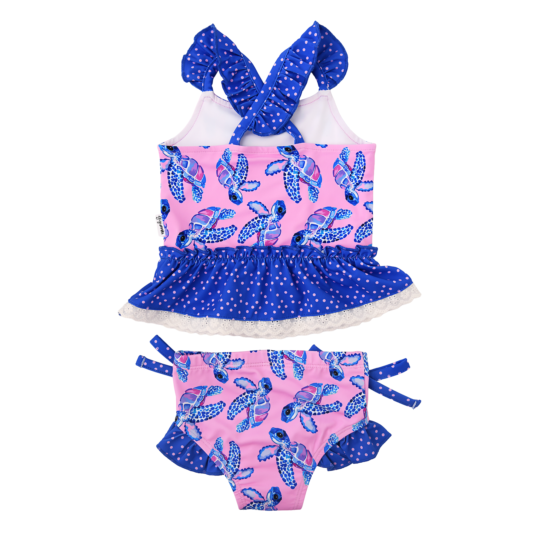 The ruffle tank features a flattering peplum fit with delicate trim, paired with coordinating full coverage bottoms that stay in place for easy movement and play.